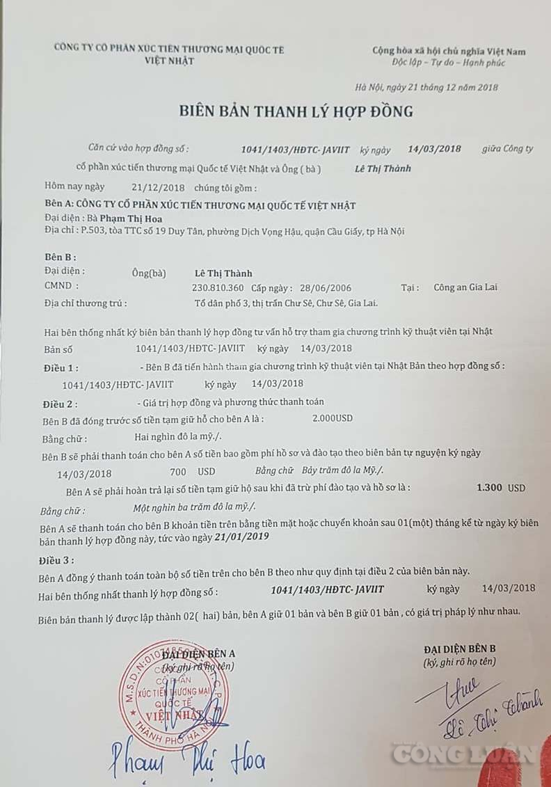Không thể đưa người đi Nhật Bản, Công ty Việt Nhật đã thanh lí hợp đồng với người lao động và thu lại 700 USD phí hồ sơ và đào tạo