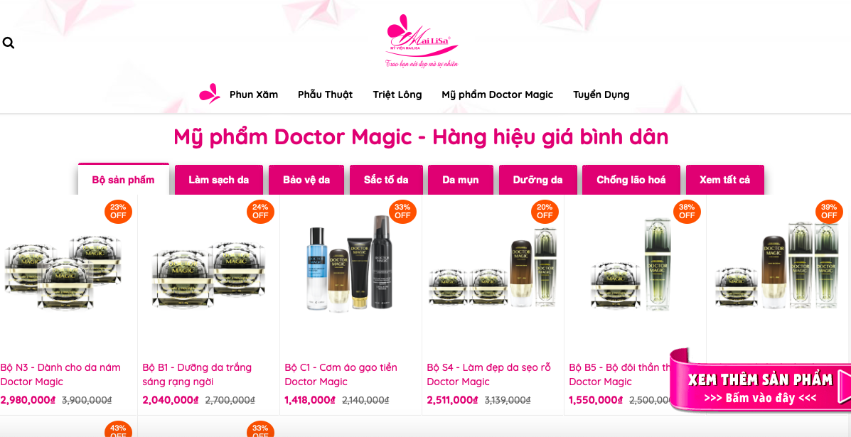 Trên website https://mailisa.com có nhiều nội dung quảng cáo về các dịch vụ của Thẩm mỹ viện Mailisa như phun xăm, phẫu thuật, triệt lông và bán các sản phẩm mỹ phẩm mang nhãn hiệu Doctor Magic.