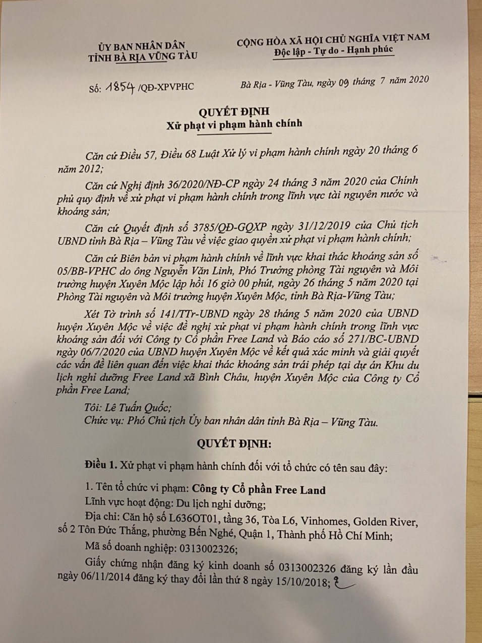 Trước đó, theo quyết định xử phạt vi phạm hành chính do Phó Chủ tịch UBND tỉnh Bà Rịa - Vũng Tàu, ông Lê Tuấn Quốc ký ngày 9/7/2020, Công ty Cổ phần Free Land địa chỉ tại căn hộ số L636OT01, tầng 36, toà L6, Vinhomes Golden River, 2 Tôn Đức Thắng, phường Bến Nghé, Quận 1, TP HCM (do bà Vũ Minh Lý - Chủ tịch Hội đồng quản trị đại diện pháp luật) đã có hành vi khai thác khoáng sản trái phép, với khối lượng khai thác trên 50m3 tại dự án Khu du lịch nghỉ dưỡng Free Land (xã Bình Châu, huyện Xuyên Mộc, tỉnh Bà Rịa - Vũng Tàu).