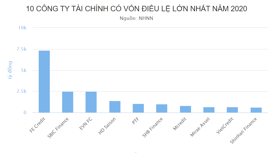 Trong đó, một số doanh nghiệp có vốn điều lệ lớn nhất hiện nay là FE Credit (7.328 tỷ); SBIC Finance (2.523 tỷ); EVN FC (2.500 tỷ); HD Saison (1.400 tỷ); Tài chính Bưu điện - PTF (1.050 tỷ); SHB Finance (1.000 tỷ)…
