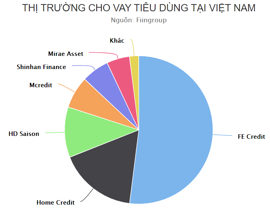 Tuy nhiên, thị trường cho vay tiêu dùng hiện vẫn nằm chủ yếu trong tay 3 doanh nghiệp FE Credit, HD Saison và Home Credit với khoảng 80% thị phần. Trong đó, riêng FE Credit hiện chiếm hơn 52% thị phần cho vay tiêu dùng trong nước, bỏ xa đối thủ đứng thứ 2 là Home Credit với 17% và thứ 3 là HD Saison với 11%.