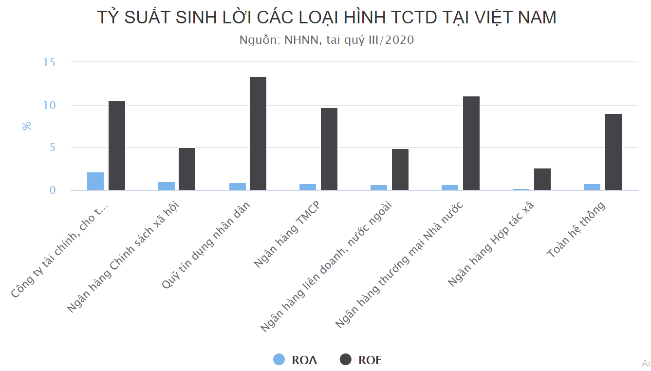 Tại thời điểm tháng 10/2020 (số liệu mới nhất), chỉ số ROA (lợi nhuận/tổng tài sản) và ROE (lợi nhuận/vốn chủ sở hữu) của các công ty tài chính, cho thuê tài chính đạt lần lượt 2,19% và 10,55%, cao nhất trong các loại hình tổ chức tín dụng. Chỉ số ROA của nhóm công ty này thậm chí cao gấp 2,8 lần nhóm ngân hàng thương mại cổ phần.