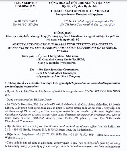 Cụ thể, cổ đông lớn Stada Service Holding B.V đăng ký mua 1,1 triệu cổ phiếu PME để nâng sở hữu từ 88,23% lên thành 89,7% vốn điều lệ tại Pymepharco, giao dịch dự kiến thực hiện từ 23/02 đến 23/03.