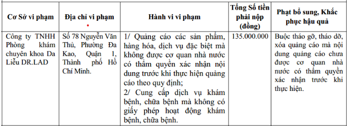 Cùng với phạt tiền, Thanh tra Sở Y tế buộc Phòng khám da liễu Dr.Lad phải tháo gỡ, xóa quảng cáo mà nội dung quảng cáo chưa được cơ quan nhà nước có thẩm quyền xác nhận trước khi thực hiện.