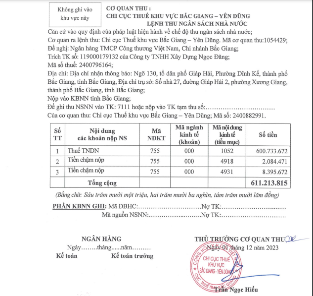 Công ty TNHH Xây dựng Ngọc Đăng vừa bị Cục Thuế tỉnh Bắc Giang yêu cầu phong toả tài khoản do nợ thuế quá hạn với số tiền hơn 610 triệu đồng.