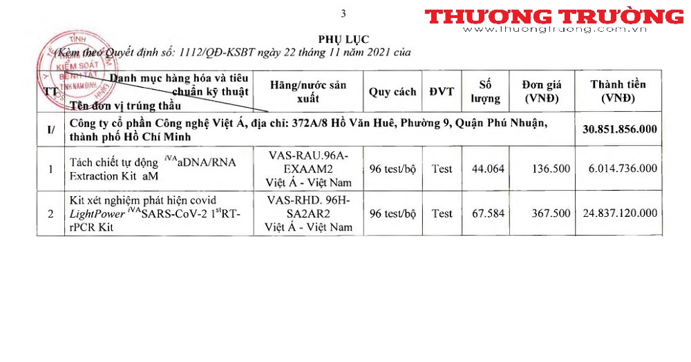 Qua tìm hiểu của PV Thương Trường, gói thầu có giá trị hàng chục tỷ đồng gần đây nhất mà Công ty Việt Á trúng thầu là gói thầu "Mua sinh phẩm xét nghiệm SARS-CoV-2" của Trung tâm Kiếm soát bệnh tật tỉnh Nam Định (CDC Nam Định).