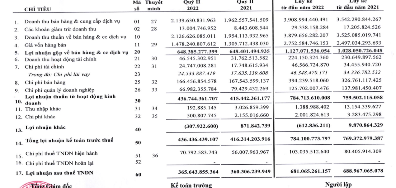 Kết quả, LNST và EPS quý II không thay đổi nhiều so với quý II/2021, lần lượt đạt 365 tỷ đồng và 1.194 đồng.