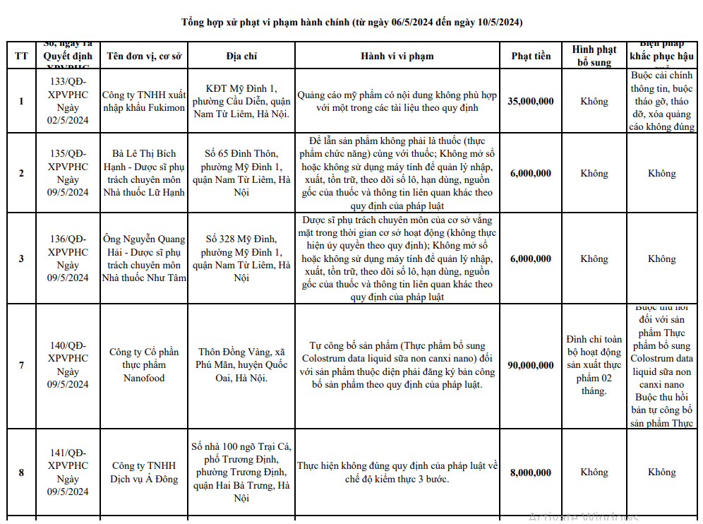 Danh sách tổng hợp xử phạt vi phạm hành chính (từ ngày 06/5/2024 đến ngày 10/5/2024)