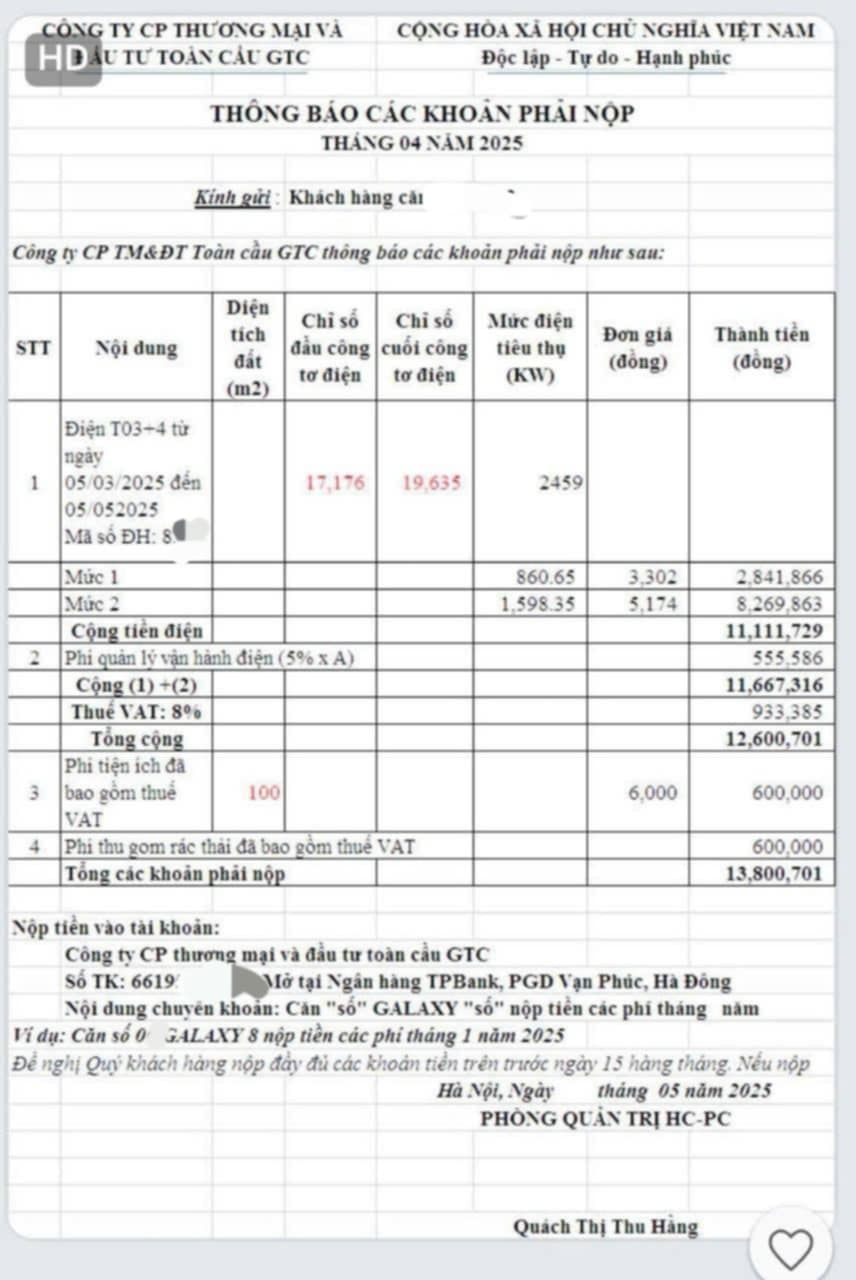 Tình trạng càng nghiêm trọng khi Công ty GTC – đơn vị thu tiền điện không ký kết bất kỳ hợp đồng minh bạch nào với cư dân. Họ tự ý áp đặt giá và yêu cầu chuyển tiền vào các tài khoản cá nhân hoặc doanh nghiệp mập mờ, không minh bạch. Hành vi này đặt dấu hỏi lớn về tính hợp pháp và minh bạch trong quá trình cung cấp dịch vụ thiết yếu tại khu đô thị này.
