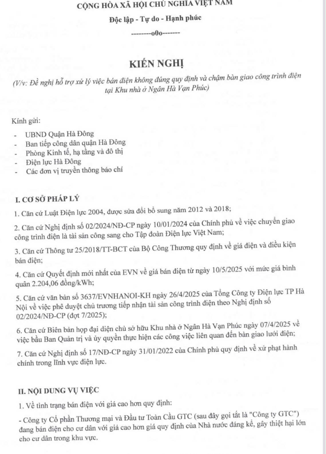 Trước tình trạng trên, ông H.V.S cùng nhiều cư dân khác đã gửi đơn kiến nghị tới các cơ quan báo chí, quản lý Nhà nước, ngành điện lực và chính quyền địa phương đề nghị sớm vào cuộc kiểm tra, làm rõ trách nhiệm của chủ đầu tư, xử lý nghiêm các sai phạm nếu có và bảo vệ quyền lợi chính đáng của người dân.