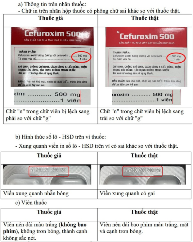 Sau khi đối chiếu, xem xét, để đảm bảo an toàn cho người sử dụng, Cục Quản lý Dược đề nghị Sở Y tế các tỉnh, thành phố trực thuộc Trung ương, Y tế các ngành: Thông báo cho các cơ sở kinh doanh, sử dụng thuốc thông tin về thuốc giả trên nhãn ghi: Viên nén dài bao phim CEFUROXIM 500, SĐK: VD-27836- 17, lô SX: 71240820, NSX: 240820, HD: 240823; Cơ sở sản xuất: Công ty cổ phần Dược phẩm Cửu Long (tên doanh nghiệp có có thuốc bị làm giả thương hiệu). Các đặc điểm, dấu hiệu phân biệt với thuốc thật như sau: