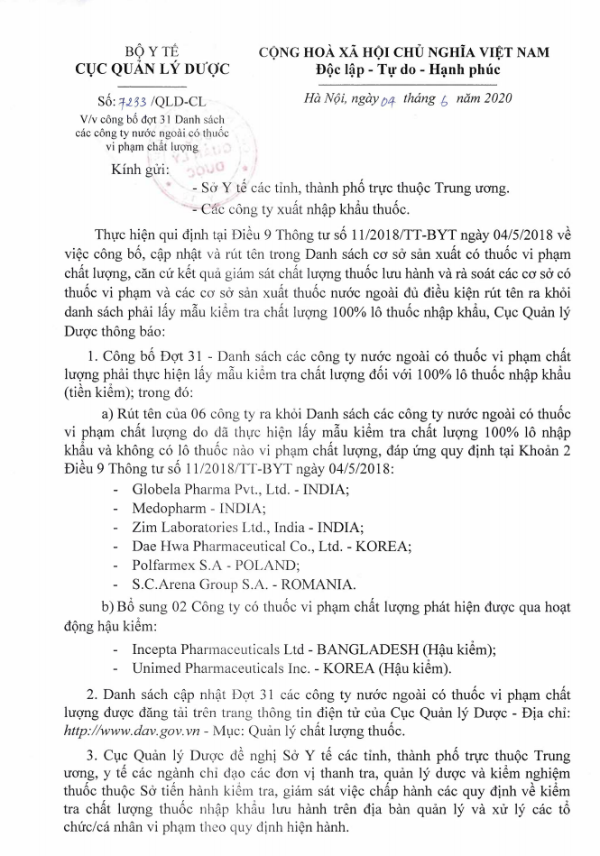 Cụ thể, theo văn bản trên, Cục Quản lý Dược yêu rút tên 06 công ty ra khỏi Danh sách các CSSX thuốc nước ngoài có thuốc vi phạm chất lượng do đã thực hiện lấy mẫu kiểm tra chất lượng 100% lô thuốc nhập khẩu và không có lô thuốc nào vi phạm chất lượng. 06 công ty đó bao gồm: Globela Pharma Pvt,...Ltd, INDIA; Medopharm - INDIA; Zim Laboratories Ltd., india - INDIA; Dae Hwa Pharmaceutical Co., Ltd. KOREA; Polfamex S.A - POLAND; S.C.Arena Group S.A. ROMANIA.