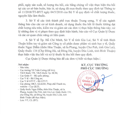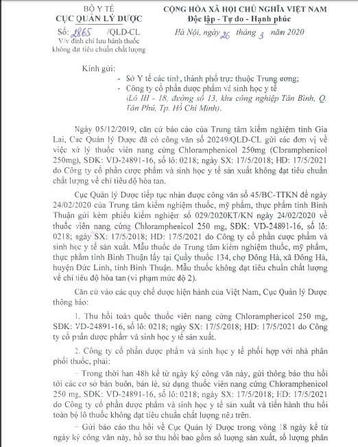 Trong thời hạn 48h kê từ ngày ký công văn này, gửi thông báo thu hồi tói các cơ sở bán buôn, bán lẻ, sử dụng thuốc viên nang cứng Chloramphenicol 250 mg, SĐK: VD-24891-16, số lô: 0218; ngày SX: 17/5/2018; HD: 17/5/2021 do Công ty cô phân dược phâm và sinh học y tế sản xuất và tiên hành thu hồi toàn bộ lô thuốc không đạt tiêu chuân chất lượng nêu trên.