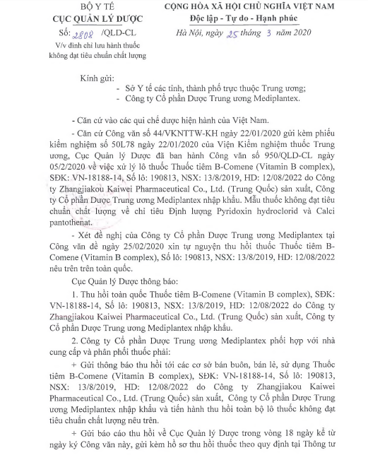 Gửi thông báo thu hồi tới các cơ sở bán buôn, bán lẻ, sử dụng Thuốc tiêm B-Comene (Vitamin B complex), SDK: VN-18188-14, số lô: 190813, NSX: 13/8/2019, HD: 12/08/2022 do Công ty Zhangjiakou Kaiwei Pharmaceutical Co., Ltd. (Trung Quốc) sản xuất, Công ty cổ phần Dược Trung ương Mediplantex nhập khấu và tiến hành thu hồi toàn bộ lô thuôc không đạt tiêu chuẩn chất lượng nêu trên.