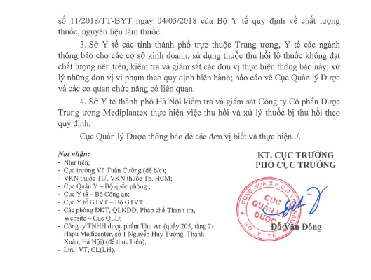 Sở Y tế các tỉnh thành phố trực thuộc Trung ương, Y tê các ngành thông báo cho các cơ sở kinh doanh, sử dụng thuốc thu hồi lô thuốc không đạt chất lượng nêu trên, kiêm tra và giám sát các đơn vị thực hiện thông báo này; xử lý nhũng đơn vị vi phạm theo quy định hiện hành; báo cáo về Cục Quản lý Dược và các cơ quan chức năng có liên quan.