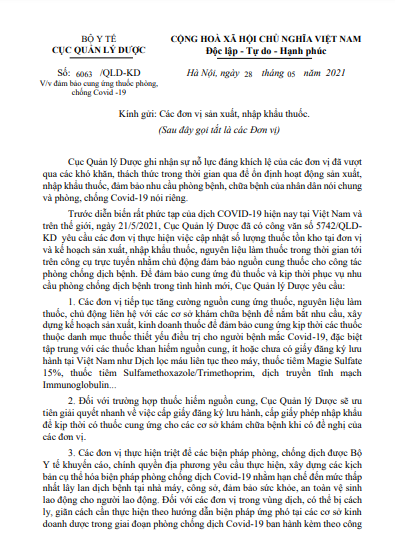 Trước diễn biến rất phức tạp của dịch COVID-19 hiện nay tại Việt Nam và trên thế giới, ngày 21/5/2021, Cục Quản lý Dược đã có công văn số 5742/QLDKD yêu cầu các đơn vị thực hiện việc cập nhật số lượng thuốc tồn kho tại đơn vị và kế hoạch sản xuất, nhập khẩu thuốc, nguyên liệu làm thuốc trong thời gian tới trên công cụ trực tuyến nhằm chủ động đảm bảo nguồn cung thuốc cho công tác phòng chống dịch bệnh. Để đảm bảo cung ứng đủ thuốc và kịp thời phục vụ nhu cầu phòng chống dịch bệnh trong tình hình mới, Cục Quản lý Dược yêu cầu: