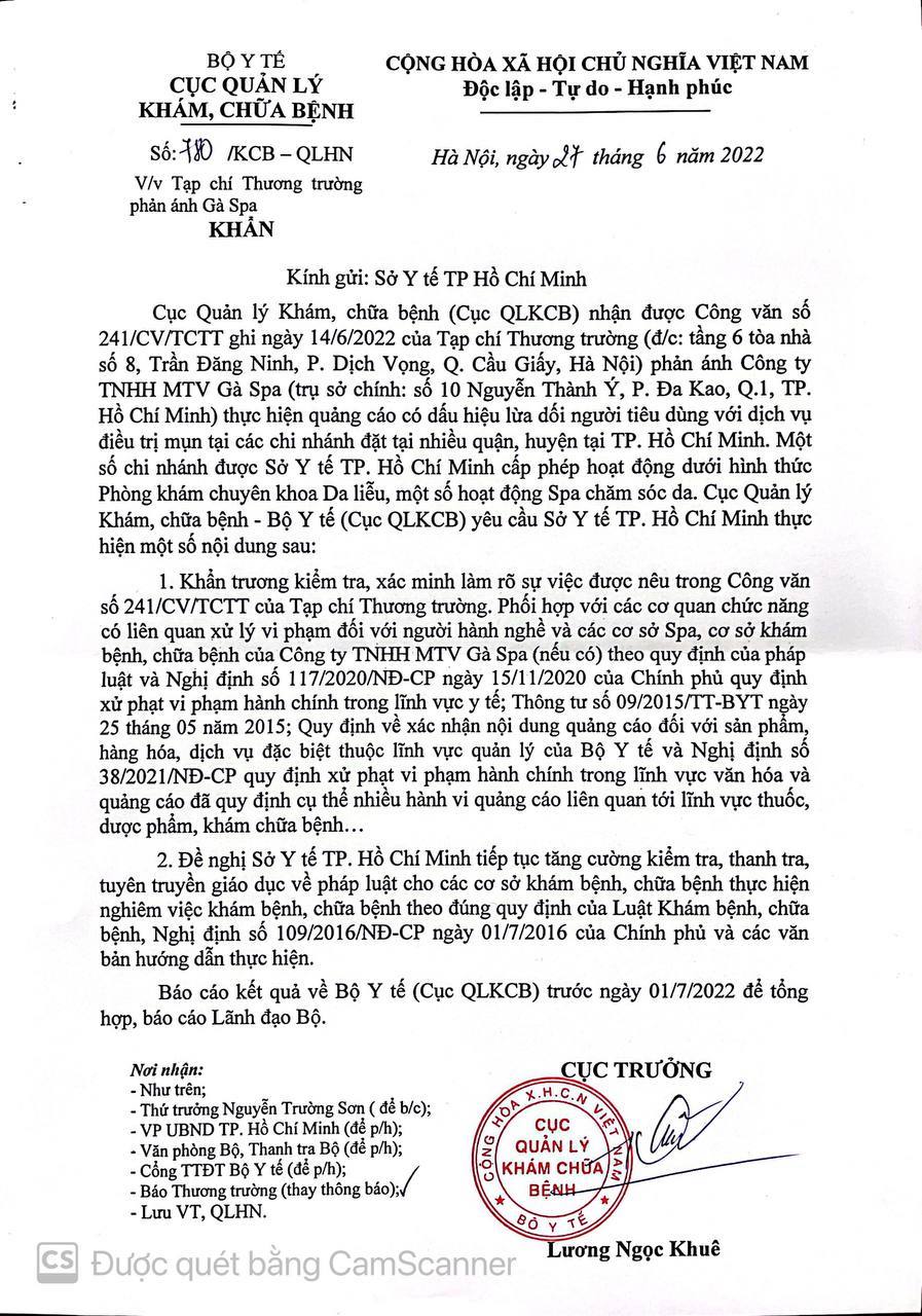 Ngày 27/6/2022, Cục Trưởng Cục Quản lý Khám, chữa bệnh - Bộ Y tế Lương Ngọc Khuê đã ký Công văn Khẩn số 780/KCB - QLHN, gửi Sở Y tế TP.HCM yêu cầu khẩn trương kiểm tra, xác minh làm rõ sự việc được Tạp chí Thuơng Trường phản ánh về Gà Spa.