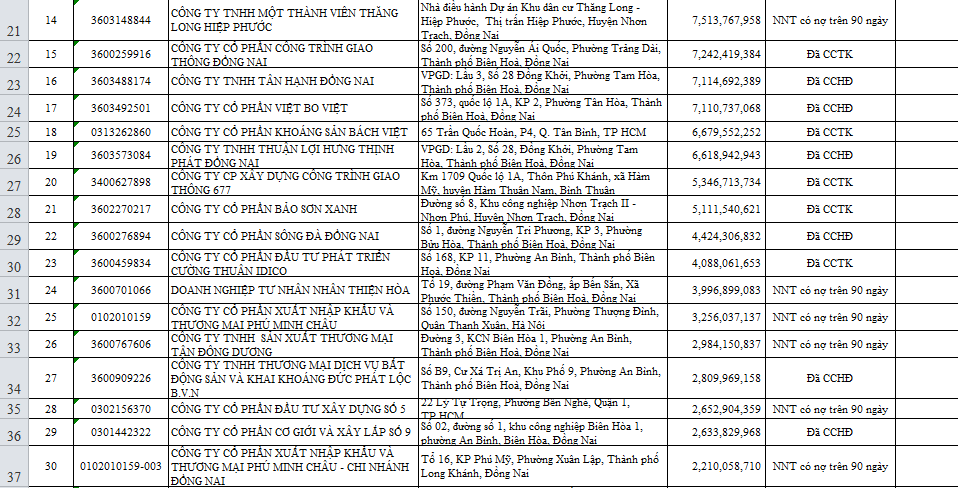 Một số công ty khác cũng có số nợ thuế lên đến hàng chục tỷ đồng như: Công ty Cổ phần tập đoàn Tân Mai (đường số 11, KCN Biên Hòa 1, phường An Bình, TP Biên Hòa) nợ thuế gần 36 tỷ đồng; Công ty cổ phần du lịch Giang Điền (ấp Hòa Bình, xã Giang Điền, huyện Trảng Bom) nợ gần 30 tỷ đồng; Công ty cổ phần sản xuất và đầu tư Hoàng Gia (KCN Nhơn Trạch 2 - Nhơn Phú, thị trấn Hiệp Phước, huyện Nhơn Trạch) nợ thuế gần 27 tỷ đồng. Đa số các công ty nợ thuế đã bị cơ quan thuế tiến hành phong tỏa tài khoản tại các ngân hàng. Điển hình có Công ty TNHH thương mại quốc tế Hoàng Nam Anh nợ thuế trên 22 tỷ đồng đã bị cơ quan chức năng cưỡng chế với hình thức dừng thủ tục hải quan đối với hàng hóa xuất, nhập khẩu.