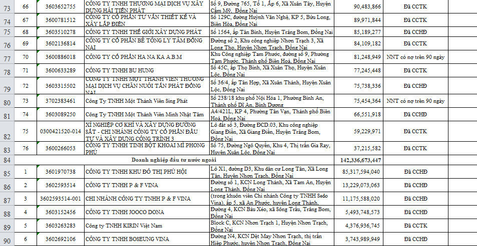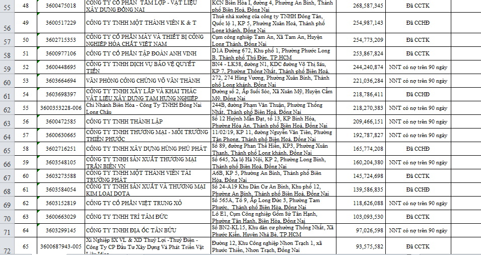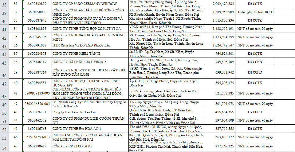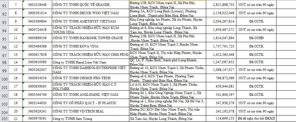 Dưới đây là danh sách chi tiết 97 doanh nghiệp nợ thuế trên địa bàn tỉnh Đồng Nai (tính đến thời điểm ngày 30/6/2021):