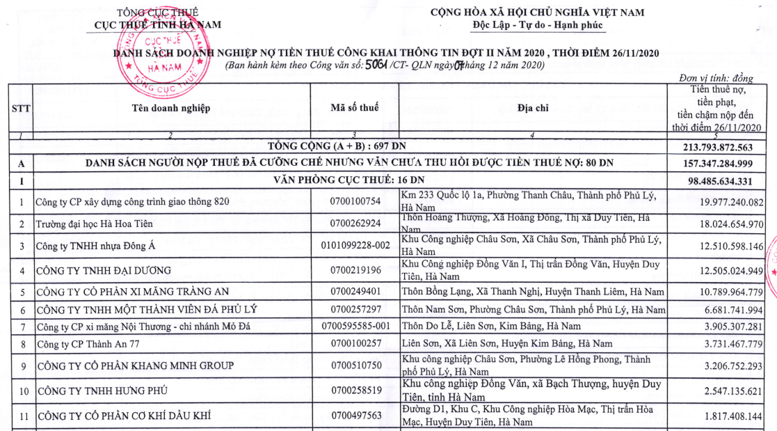 Mới đây, Cục thuế Hà Nam vừa công khai danh sách (kèm theo Công văn số 5061/CT-QLN) các doanh nghiệp nợ thuế đợt 2/2020 tính đến thời điểm 26/11/2020.