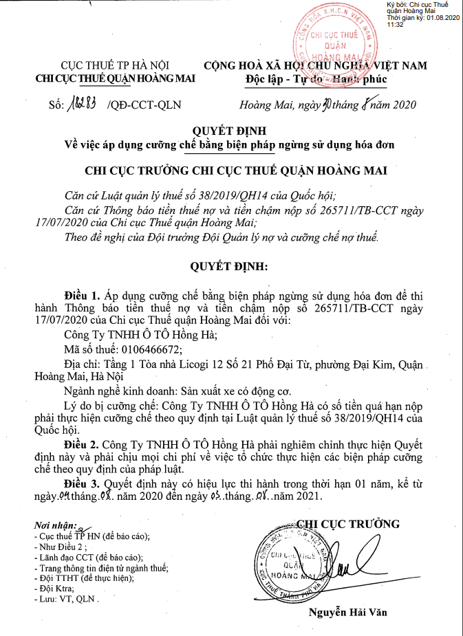 Theo văn bản trên, Công ty TNHH Ô tô Hồng Hà bị cưỡng chế với lý do có số tiền quá hạn nộp nên phải thực hiện cưỡng chế theo quy định của Luật Quản lý Thuế. Cụ thể, Cục thuế Hà Nội sẽ áp dụng biện pháp cưỡng chế ngừng sử dụng hóa đơn để thi hành Thông báo tiền thuế nợ và tiền chậm nộp số 265711/TB-CCT ngày 17/07/2020 của Chi cục Thuế quận Hoàng Mai.