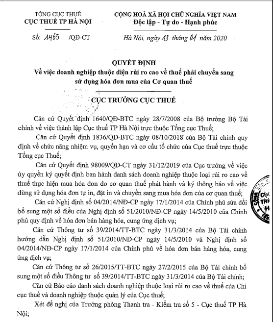 Quyết định số 1465/QĐ-CT về việc doanh nghiệp thuộc diện rủi ro cao về thuế phải chuyển sang hóa đơn mua của Cơ quan thuế. Nguồn: CTHN.