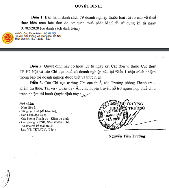 Theo Quyết định trên, có 79 doanh nghiệp thuộc diện rủi ro cao về thuế phải chuyển sang hóa đơn mua của Cơ quan thuế bắt đầu từ ngày 01/02/2020. Được biết, Quyết định này có hiệu lực kể từ ngày kí và các cơ quan, đơn vị thuộc Cục thuế Hà Nội có doanh nghiệp được nêu chịu trách nhiệm thi hành.