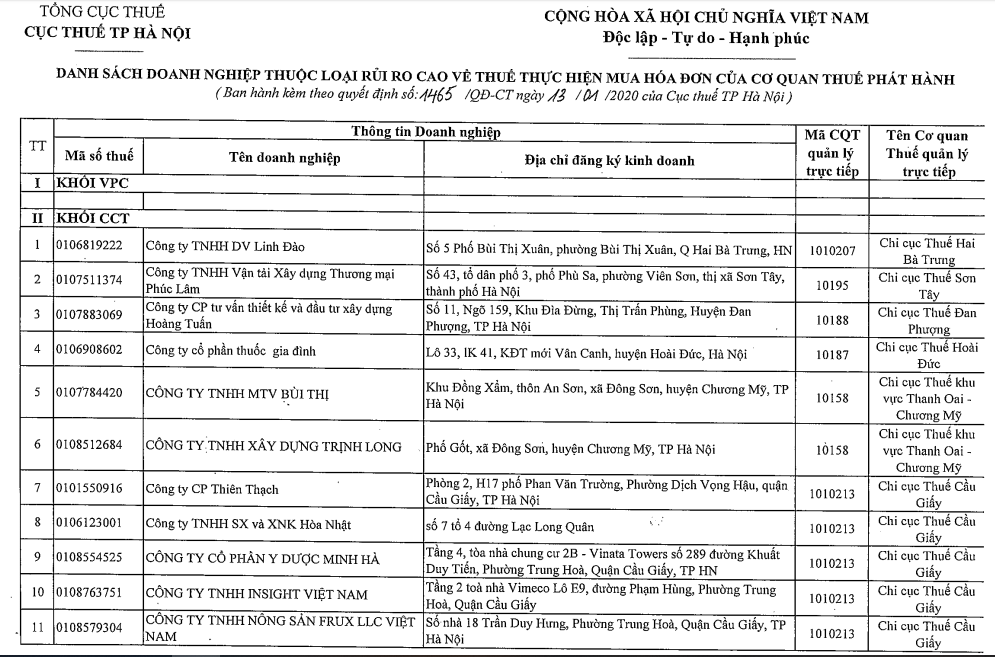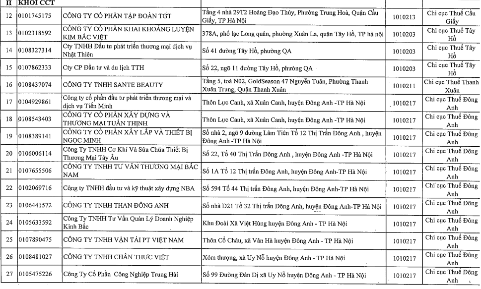 Còn lại là các doanh nghiệp thuộc các Chi cục thuế Thanh Xuân, Hoài Đức, Sơn Tây và Hai Bà Trưng.