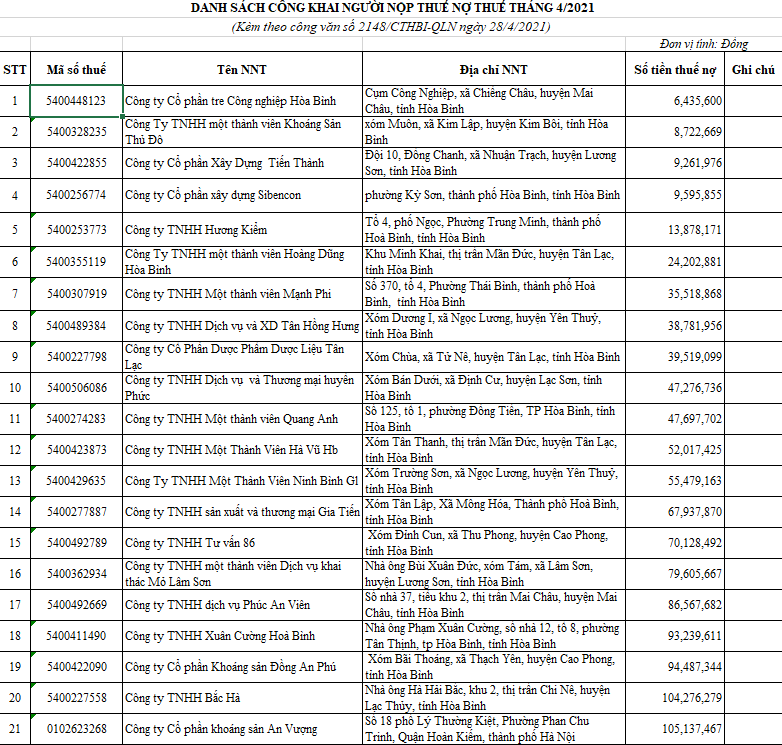 Danh sách chi tiết 84 doanh nghiệp Hòa Bình nợ thuế trong tháng 4/2021: