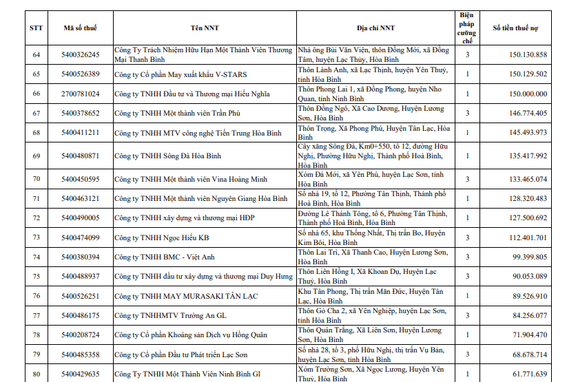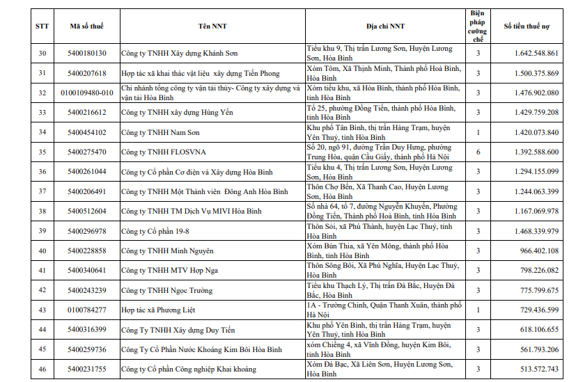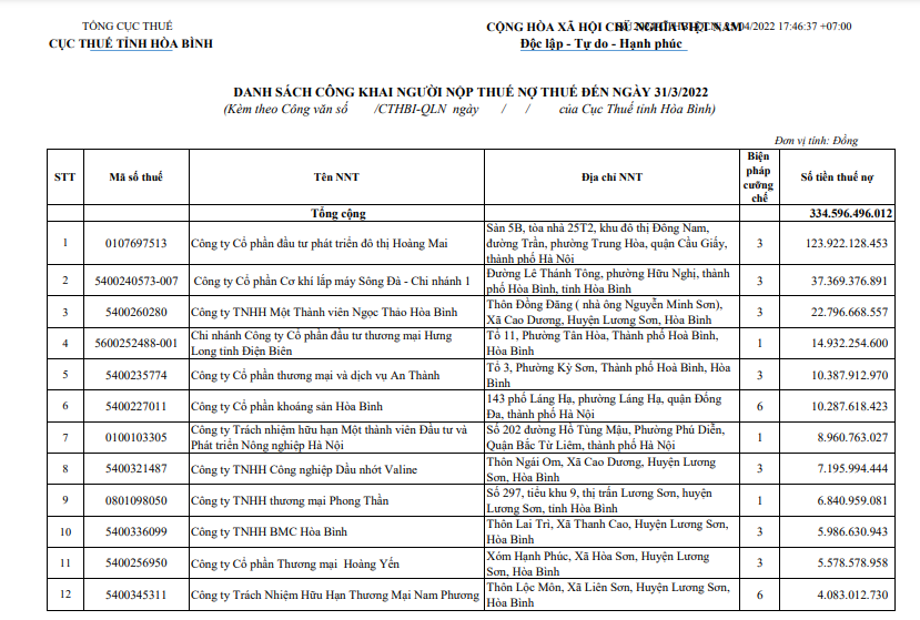 Mới đây, Cục Thuế tỉnh Hòa Bình đã ban hành văn bản công khai danh sách 104 tổ chức, doanh nghiệp, cá nhân nợ thuế với tổng số tiền nợ hơn 334 tỷ đồng, bao gồm tiền thuế, tiền phạt và tiền chậm nộp đến thời điểm 31/3/2022.