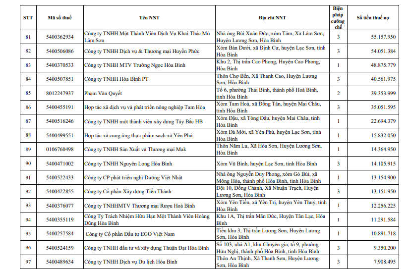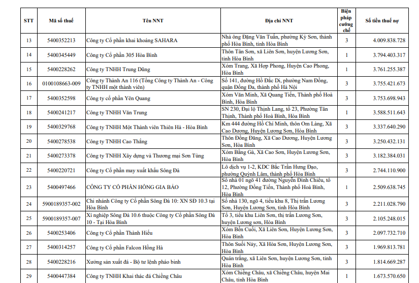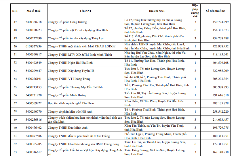 Trong danh sách Cục Thuế Hòa Bình công khai cũng có một số doanh nghiệp nợ thuế dưới 10 tỷ đồng như Công ty Trách nhiệm hữu hạn Một thành viên Đầu tư và Phát triển nông nghiệp Hà Nội (Mã số thuế: 0100103305) nợ hơn 8,9 tỷ đồng; Công ty TNHH dầu nhớt Valine (MST 5400321478) nợ hơn 7 tỷ đồng; Công ty TNHH thương mại Phong Thần (Mã số thuế: 0801098050) nợ hơn 6,8 tỷ đồng; Công ty TNHH BMC Hòa Bình (MST 5400336099) nợ hơn 5,9 tỷ đồng; CTCP Thương mại Hoàng Yến (MST 54002569509) nợ hơn 5,5 tỷ đồng.