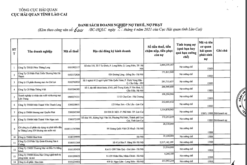 Cục thuế Lào Cai vừa có văn bản gửi Tổng cục Hải Quan về danh sách doanh nghiệp nợ thuế, nợ phạt tháng 4/2021.