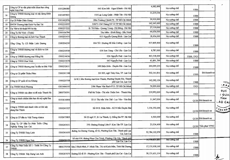 Danh sách chi tiết 53 doanh nghiệp Lào Cai nợ thuế.