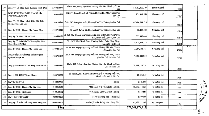 Trong tổng số 53 doanh nghiệp trên, có 6 doanh nghiệp đã khoanh nợ (CTCP Thiên Phúc, Công ty TNHH Đá Mỹ Nghệ Đại Long,...) và 3 doanh nghiệp thuộc dạng phạt hành chính (CTCP Đầu tư Phát triển Công nghiệp Rừng Lào Cai, CTCP Đầu tư Thương mại XNK Việt Phát, Công ty TNHH Thương mại Hoàng Lan).