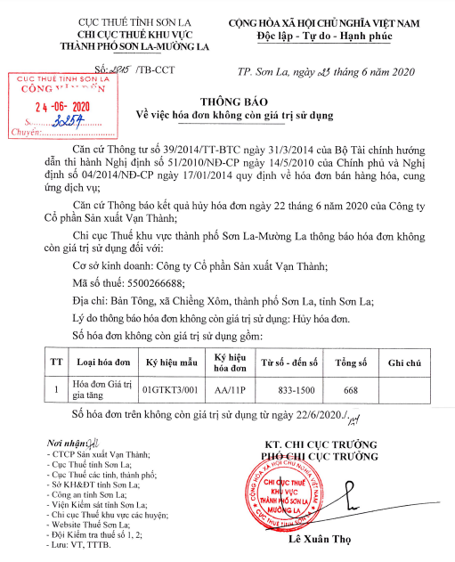 Còn tại văn bản số 2815/TB-CCT ngày 23/6/2020, Cục thuế Sơn La ra thông báo hóa đơn không còn giá trị sử dụng đối với CTCP sản xuất Vạn Thành, MST 5500266688. Công ty này có trụ sở tại Bản Tông, xã Chiềng Xôm, TP Sơn La.