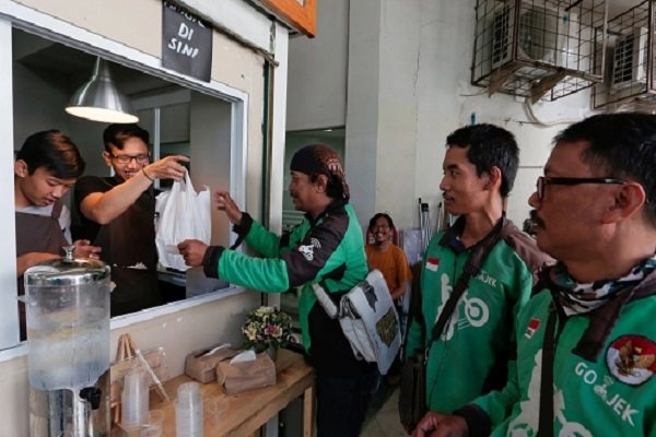 Các tài xế Go-Jek chờ đặt hàng tại một quán cà phê ở Jakarta. Ảnh: Reuters