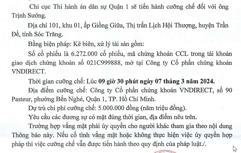 Theo thông báo, Chi cục Thi hành án dân sự Quận 1 sẽ thực hiện cưỡng chế bằng biện pháp kê biên, xử lý gần 6,3 triệu cp CCL của Công ty CP Đầu tư và Phát triển Đô thị Dầu khí Cửu Long thuộc sở hữu của ông Trịnh Sướng - cổ đông lớn sở hữu trên 5% cổ phần của công ty trong tài khoản giao dịch chứng khoán số 021C999888, mở tại Chứng khoán VNDIRECT. Thời gian thực hiện vào lúc 9h30p ngày 7/3.