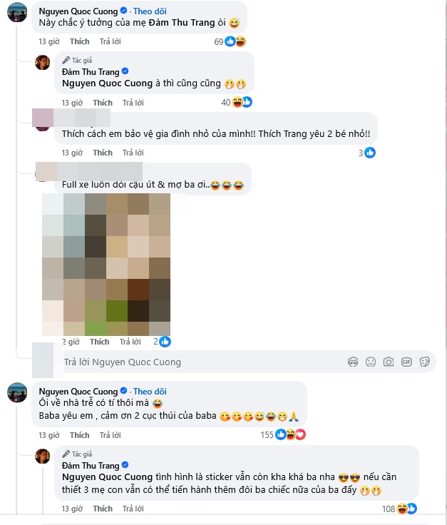 Dưới bài đăng của Đàm Thu Trang, Cường Đô La cũng nhanh chóng để lại bình luận: "Ôi về nhà trễ có tí thôi mà. Baba yêu em, cảm ơn 2 cục thúi của baba. Chắc này là ý tưởng của mẹ Đàm Thu Trang rồi".