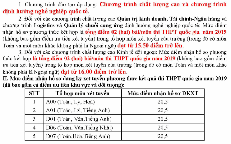 Cụ thể: mức 15,5 điểm trở lên với các chương trình tiên tiến quản trị kinh doanh, tài chính - ngân hàng, kinh tế quốc tế, kinh doanh quốc tế, quản trị kinh doanh, tài chính - ngân hàng, chương trình kinh doanh quốc tế theo mô hình tiên tiến Nhật Bản, chương trình kế toán - kiểm toán ACCA theo định hướng nghề nghiệp quốc tế, chương trình logistics và quản lý chuỗi cung ứng theo định hướng nghề nghiệp quốc tế.