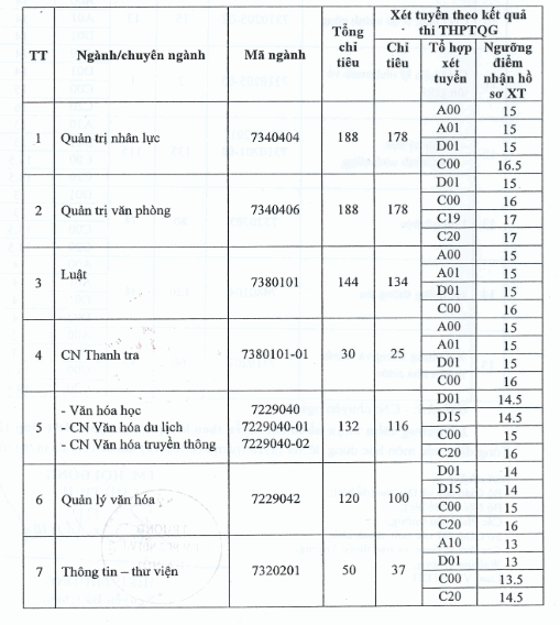 Đối với thí sinh đăng ký dự tuyển và theo học tại trụ sở chính của Trường: Tổng điểm của các môn thuộc tổ hợp xét tuyển C00 đạt ≥ 20.00 điểm, các tổ hợp khác đạt ≥ 18.00 điểm (không tính điểm ưu tiên). Ngoài ra, đối với ngành Luật Thương mại quốc tế và ngành Ngôn ngữ Anh, kết quả thi THPT Quốc gia môn Tiếng Anh ≥ 7.00 điểm.