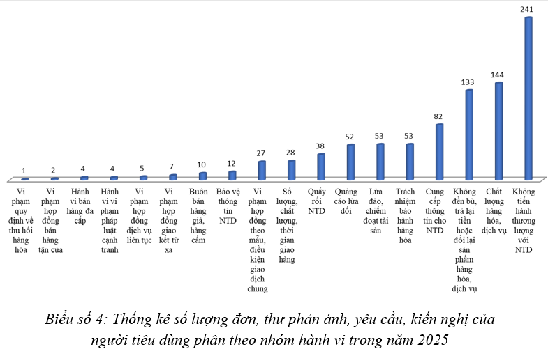 Cơ cấu số liệu nêu trên cho thấy các phản ánh của người tiêu dùng tập trung nhiều vào các vấn đề phát sinh sau giao dịch, bên cạnh những vi phạm trong giai đoạn giao kết ban đầu. Đáng chú ý, các nội dung liên quan đến chất lượng thực tế của hàng hóa, dịch vụ; trách nhiệm bảo hành, đổi trả, bồi thường; cũng như việc thương lượng giữa doanh nghiệp và người tiêu dùng chiếm tỷ trọng lớn trong tổng số phản ánh.