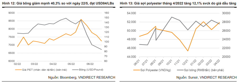 Tuy nhiên, VND kỳ vọng giá nguyên liệu đầu vào sẽ hạ nhiệt trong quý 4/2022. Cụ thể, giá hạt PET và giá bông đã giảm lần lượt 15,9% và 40,3% so với mức đỉnh vào tháng 03 sau khi giá dầu đã hạ nhiệt. VNDirect cho rằng cả giá sợi và vải đều sẽ hạ nhiệt trong quý 4/2022, theo sau giá các nguyên liệu khác. VNDirect kỳ vọng giá chip PE trung bình sẽ đạt 28.309đ/kg (+10,8% yoy) vào năm 2022 và 27.459 đồng/kg (-3% yoy) vào năm 2023. Trong khi đó, Trading Economic dự báo giá bông giao dịch ở mức 117,7USD/pound trong năm 2022. VNDirect dự báo biên lợi nhuận gộp của doanh nghiệp sợi bông giảm 1,0-1,5 điểm % trong nửa cuối 2022 do giá bông giảm dần trong 6 tháng cuối năm 22 trước khi đi ngang vào năm 2023. Trong khi đó, biên lợi nhuận gộp của các công ty may mặc như TCM, GIL, MSH sẽ được cải thiện trong năm 2023 do giá nguyên liệu đầu vào giảm và nhu cầu phục hồi đối với các sản phẩm cao cấp.