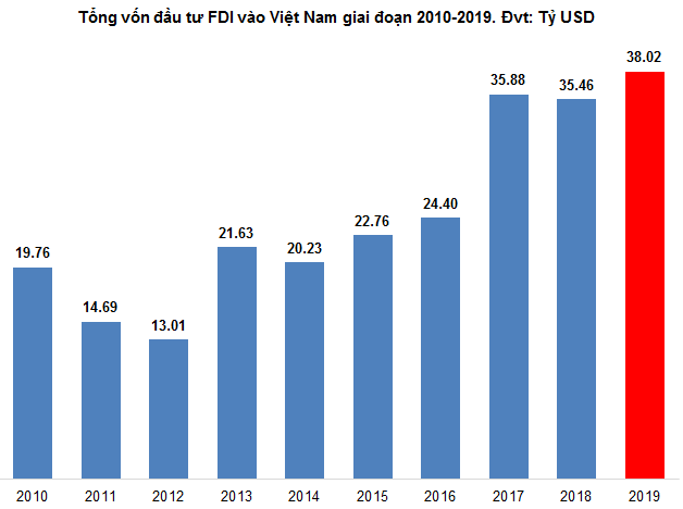 Tổng vốn đầu tư FDI vào Việt Nam có mức tăng dần đều qua các năm. Nguồn: Vietstock Finance