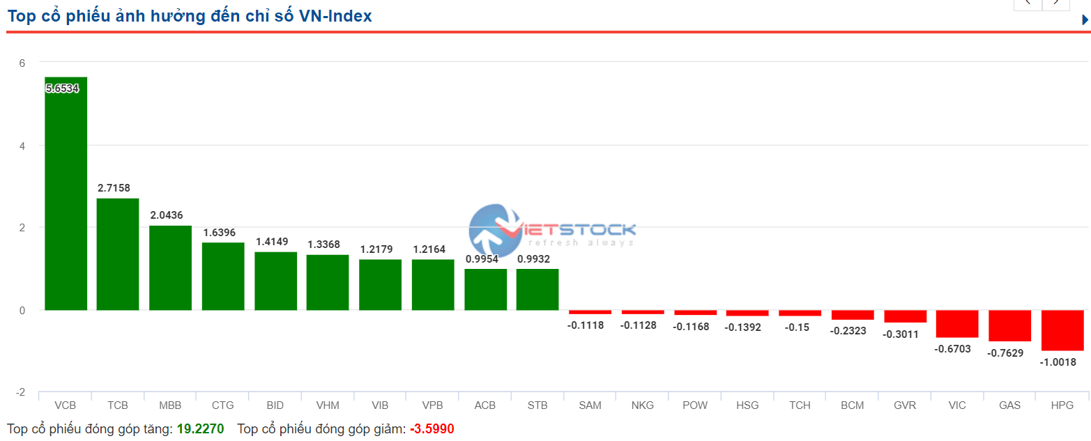 Sự bứt phá đồng loạt của nhóm ngành giúp cho chỉ số ngành ngân hàng tăng gần 5%. Trong số 10 chỉ số ảnh hưởng tích cực nhất lên chỉ số trong phiên 24/11 có đến 9 cổ phiếu là ngân hàng.