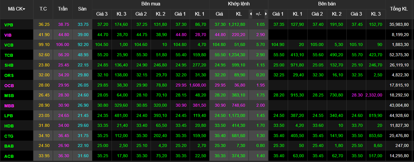Có tới 8 mã ngân hàng tăng hết biên độ là OCB, STB, VIB, MBB, SSB, MSB, HDB và EIB. Trong đó riêng OCB đã tăng kịch trần từ phiên sáng và trắng bên bán. Đóng cửa phiên giao dịch, còn 6 mã giữ được sắc tím là OCB, EIB, MBB, SSB, VIB và STB.