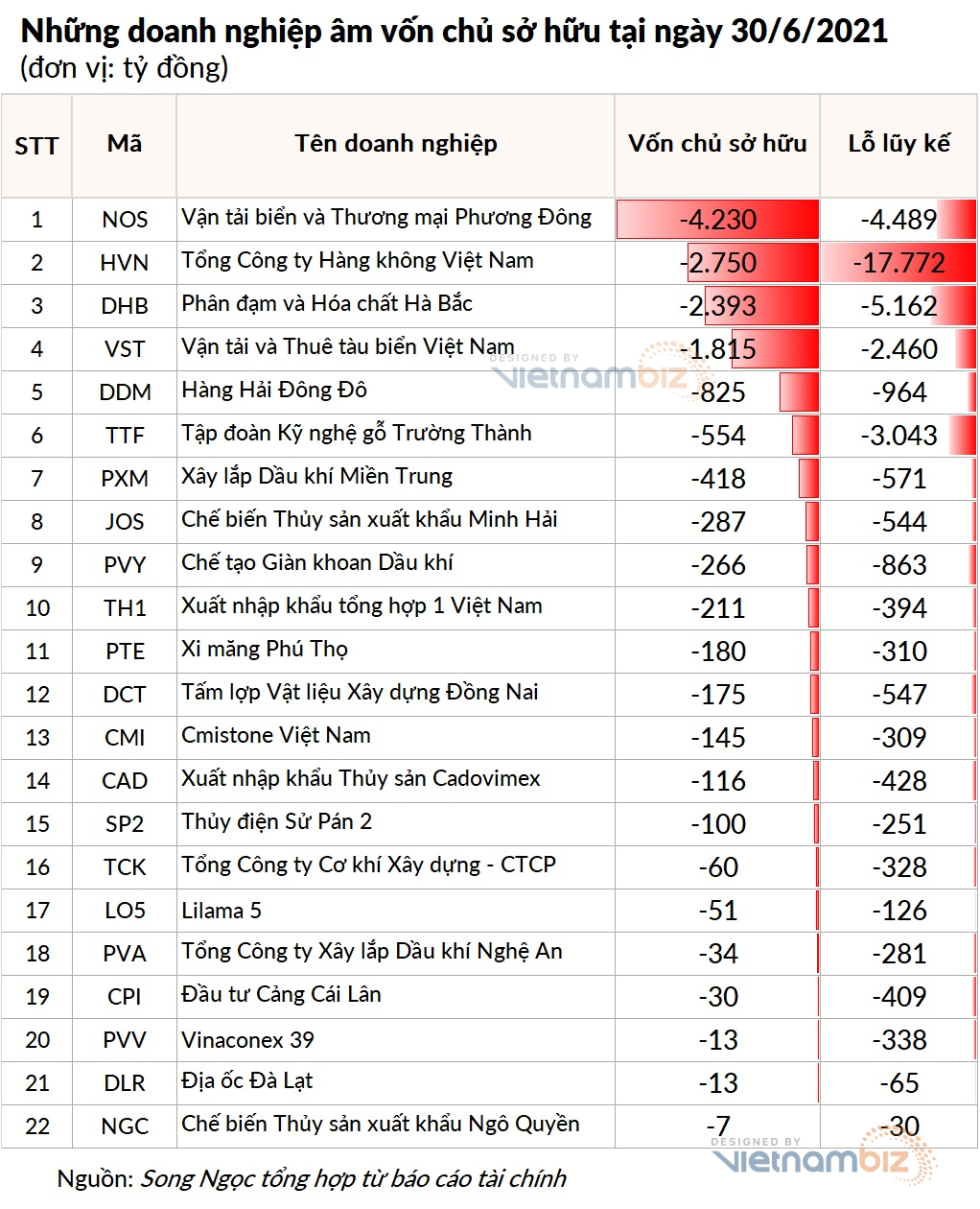 Xét trên toàn thị trường chứng khoán nước ta, Vietnam Airlines đứng thứ 2 về mức độ âm vốn chủ nhưng dẫn đầu về số lỗ lũy kế, cao gấp hơn ba lần doanh nghiệp ngay sau là Đạm Hà Bắc (Mã: DHB).