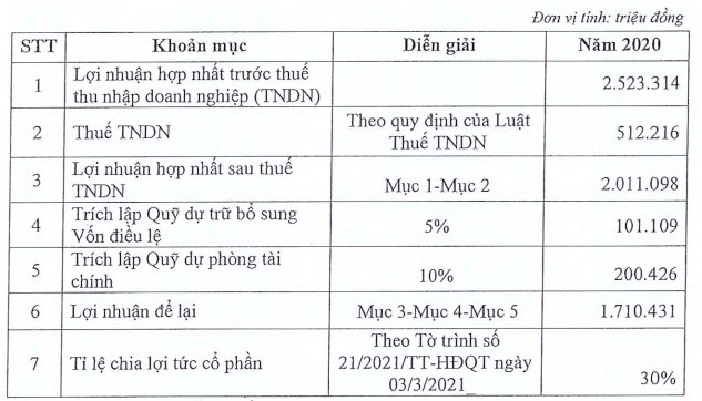 Về phương án phân phối lợi nhuận 2020, MSB dự kiến trích lập hơn 301,5 tỷ đồng cho các quỹ. Sau trích lập, lợi nhuận còn lại của MSB đạt hơn 1.710 tỷ đồng. Ngân hàng dự kiến chi trả cổ tức bằng cổ phiếu cho năm 2020 với tỷ lệ 30%.