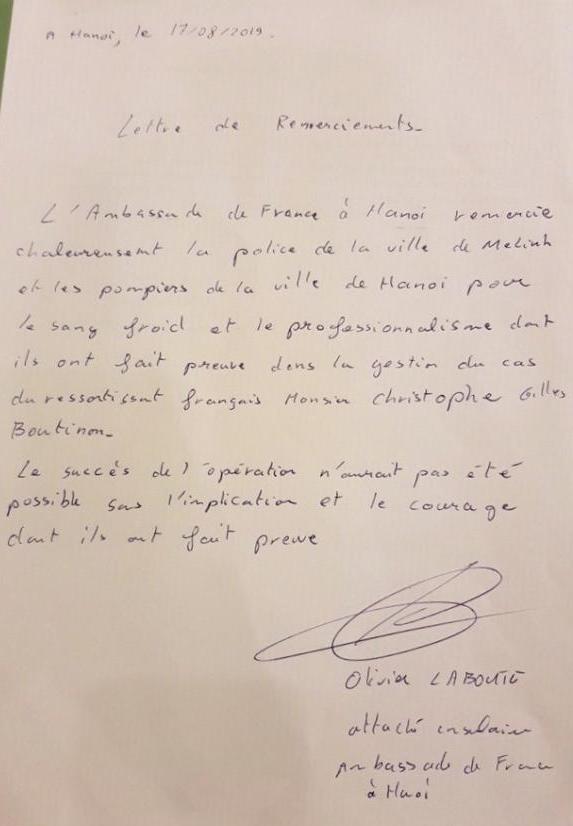 Chiều ngày 18/8, Thượng tá Trần Đình Nghĩa –Trưởng Công an huyện Mê Linh, Hà Nội cho biết, đơn vị vừa nhận được Thư cảm ơn của Đại sứ quán Pháp tại Việt Nam, về việc hỗ trợ, cứu giúp một công dân Pháp có ý định tự tử.Thư cảm ơn do ngài Oliver Laboute - đại diện Đại sứ quán Pháp tại Việt Nam bày tỏ: "Đại sứ quán Pháp chân thành cảm ơn Công an huyện Mê Linh và lực lượng Cảnh sát phòng cháy, chữa cháy – cứu nạn cứu hộ của Công an Hà Nội về sự chuyên nghiệp, nhiệt tình trong việc giải cứu ông Chirstophe Gilles Boutinon (SN 1982), quốc tịch Pháp. Nếu không có sự dũng cảm và sự phối hợp tốt của Công an Hà Nội thì việc giải cứu không thể thành công được"