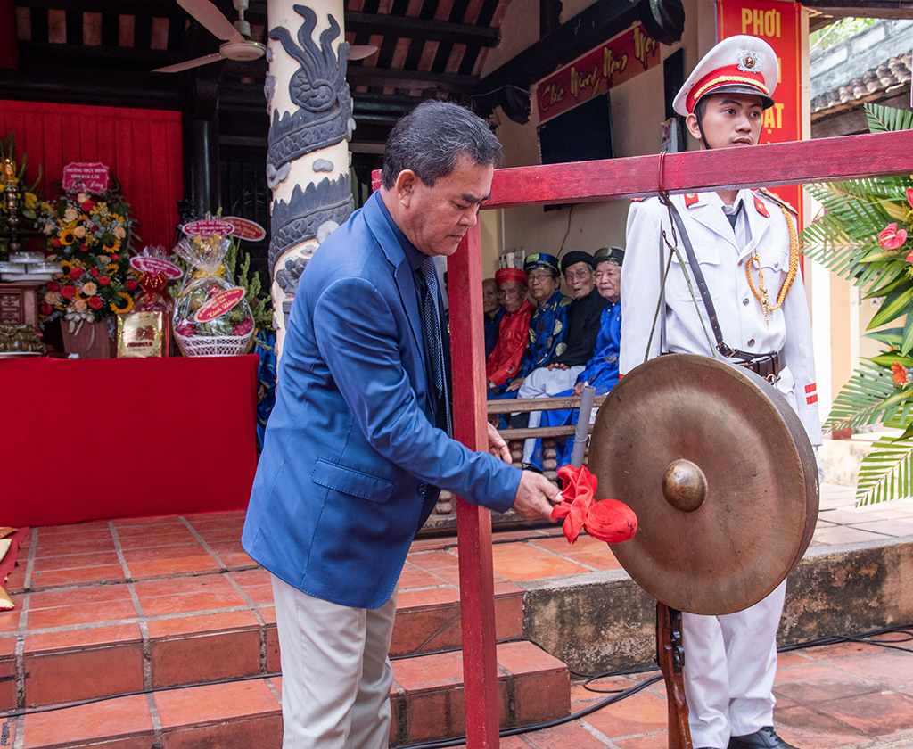 Ông Y Biêr Niê - Phó Bí thư Tỉnh ủy Đắk Lắk đánh trống để ghi nhớ những công ơn mà các Vua Hùng đã gầy công xây dựng.