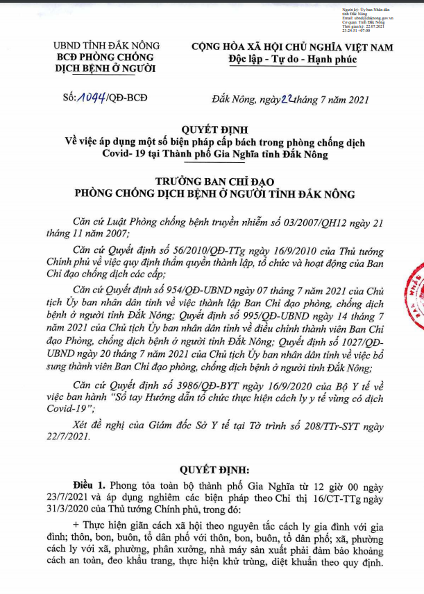 Đêm 22/7, Chủ tịch UBND tỉnh Đắk Nông Hồ Văn Mười, Trưởng Ban Chỉ đạo phòng chống dịch bệnh ở người, ban hành Quyết định số:1044/QĐ-BCD về việc áp dụng một số biện pháp cấp bách trong phòng chống dịch Covid-19 tại Thành phố Gia Nghĩa.